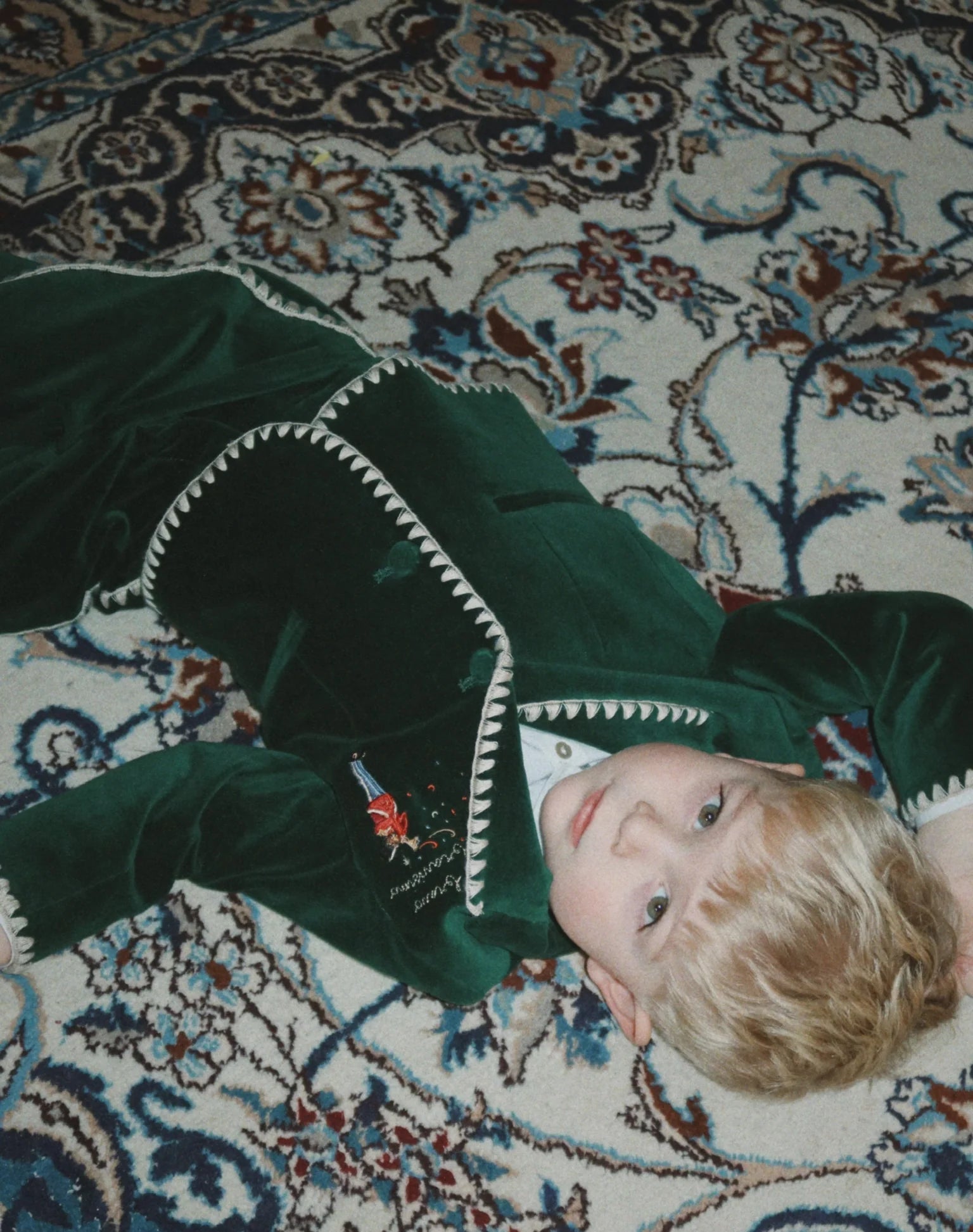 Soft velvet blazer with timeless detailing. Features classic lapels, button closure, welt pockets, and decorative white contrast stitching.