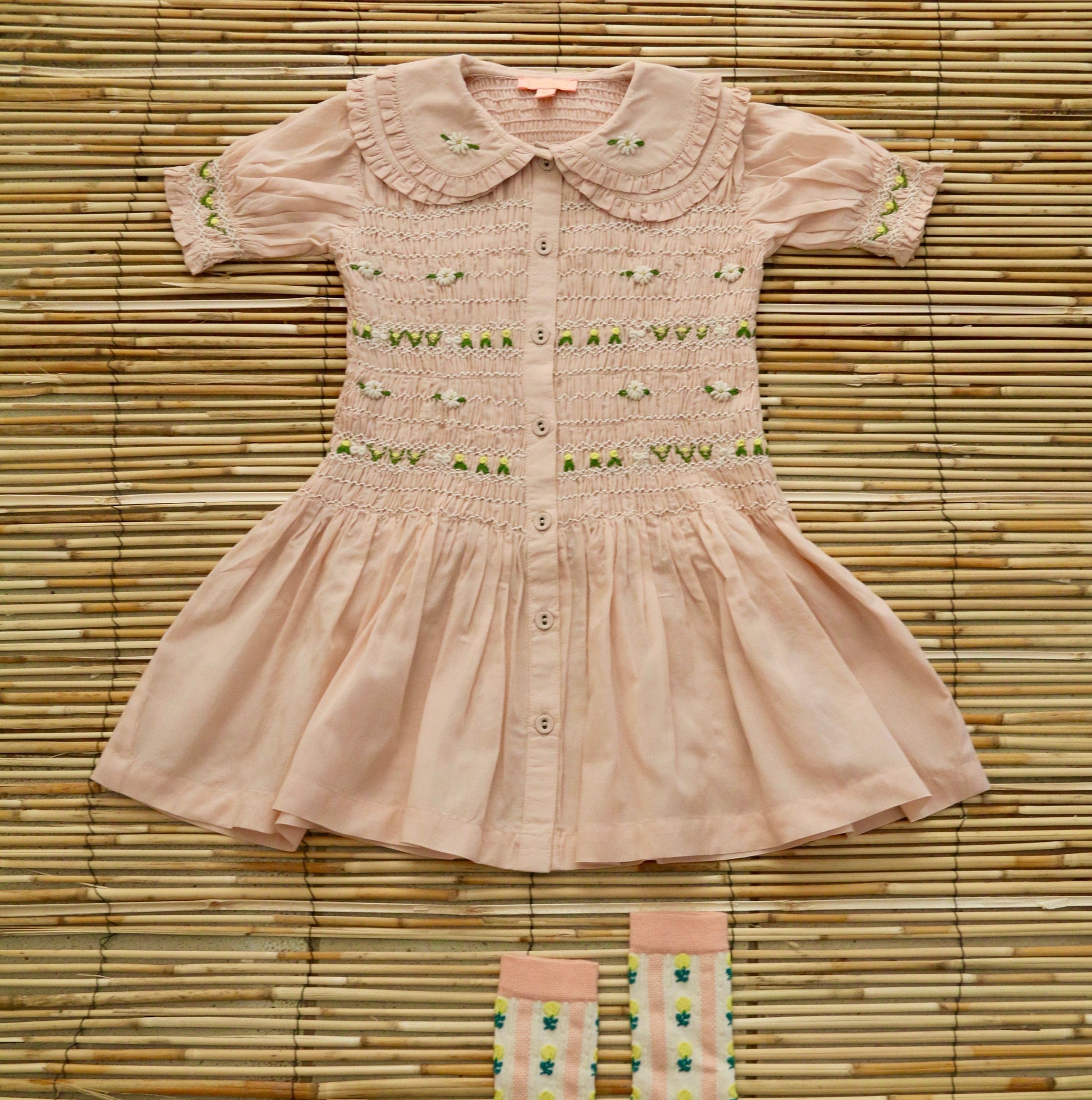 - handmade smocking on the front and sleeves