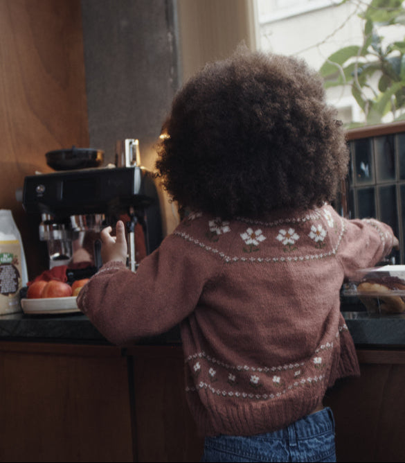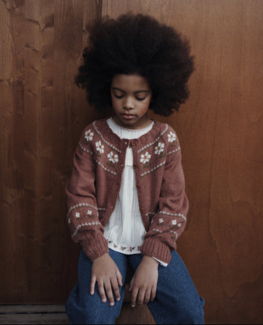 Rosewood jacquard cardigan in alpaca wool blend. This wool is knitted in jersey stitch in a rather fine yarn.