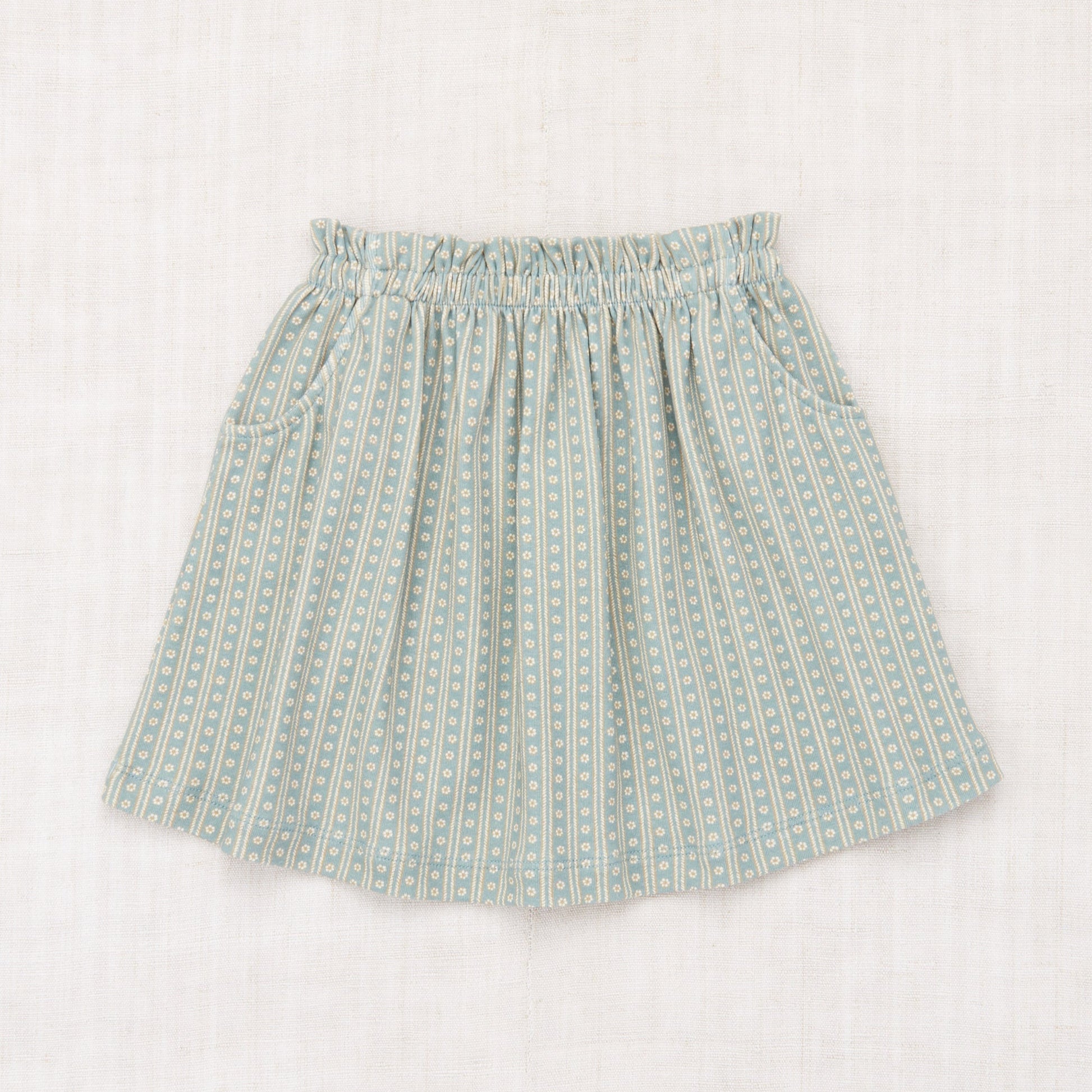 A pull-on skirt in organic Pima cotton, featuring a short, flowy silhouette, cinched ruffle elastic waistband, and two front pockets.