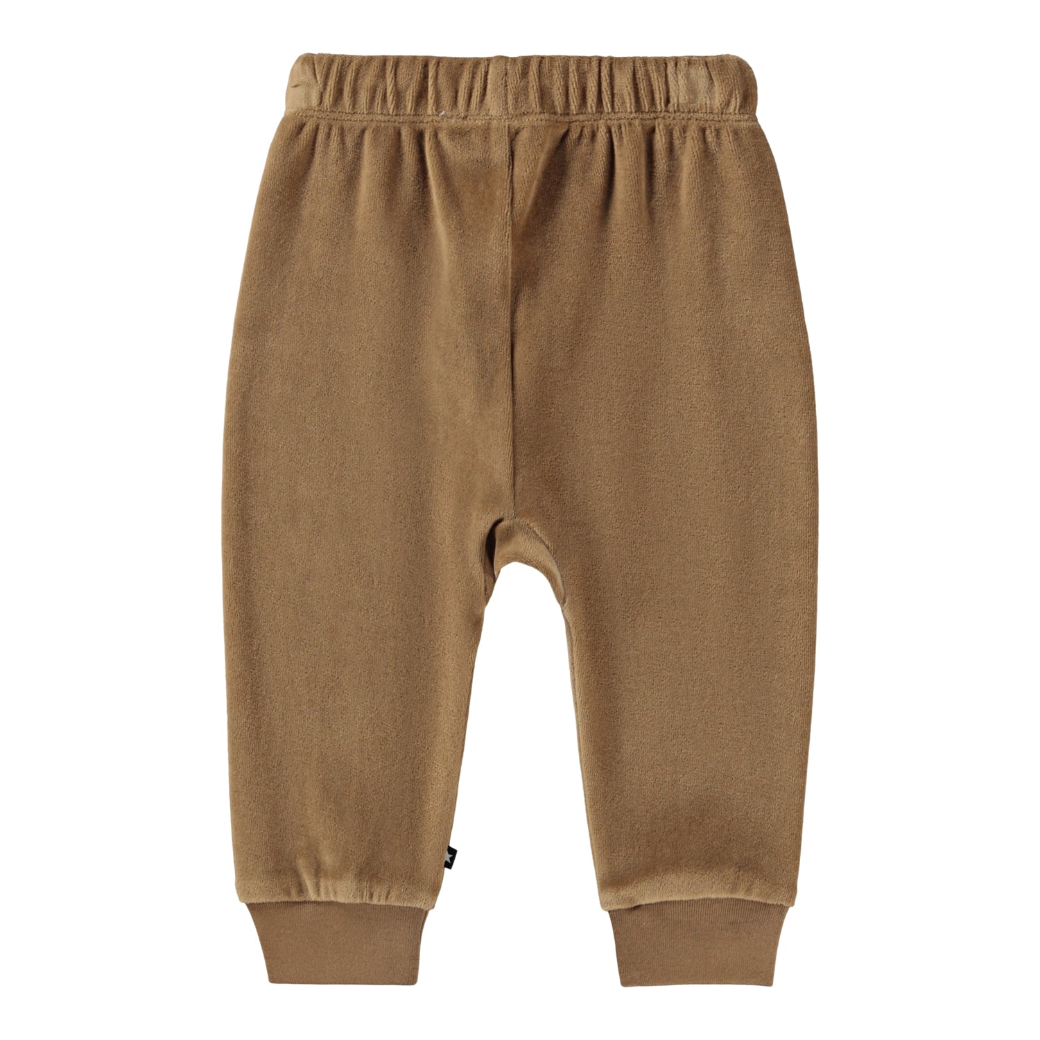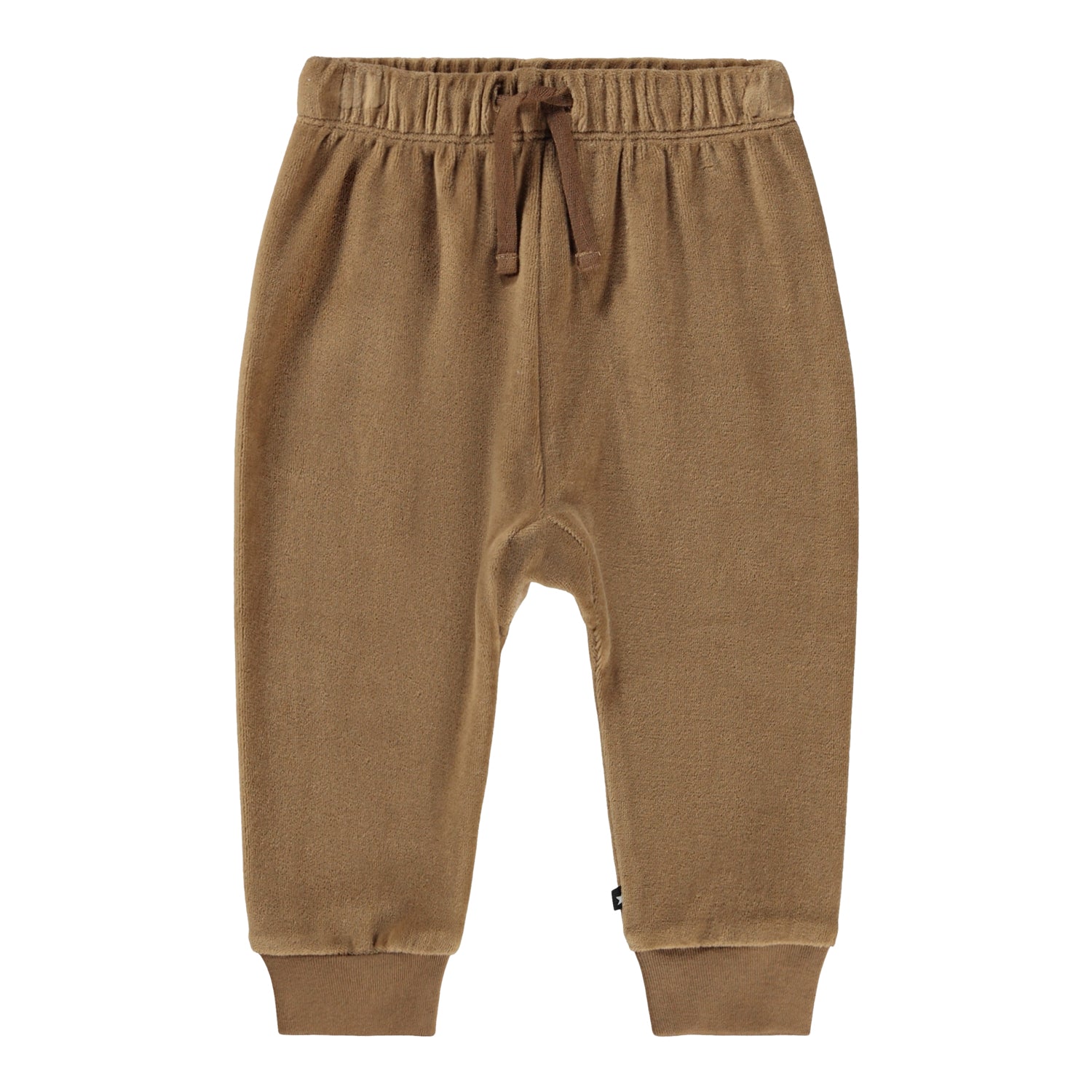 Brown pants for the little ones made of organic cotton velour. The pants have elastic and a drawstring at the waist and ribbed cuffs around the ankles to make them easy to put on and take off and providing plenty of space to move.