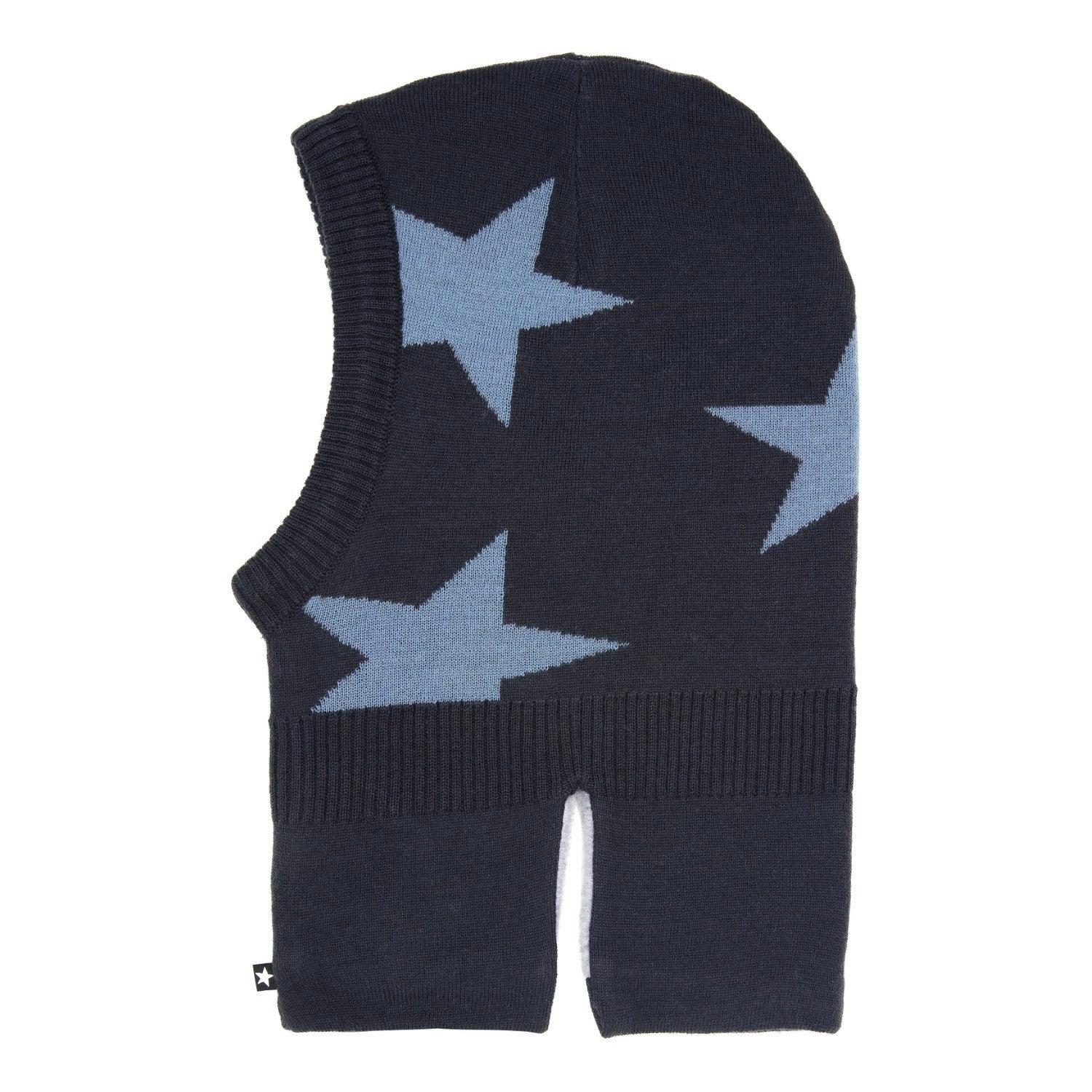 Dark navy balaclava with blue-colored intarsia stars. The balaclava has slits on the side of the neck so it fits well over the chest and shoulders.