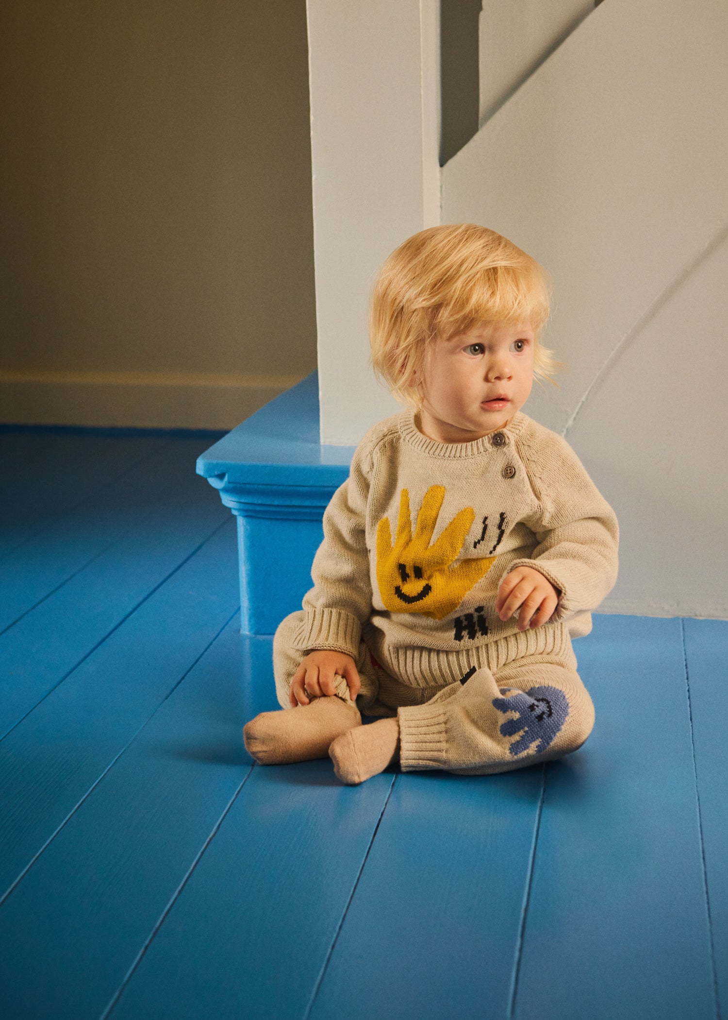 Beige pants for the little ones made of a soft ribbed knit of cotton and wool with smiling hands on the knees.