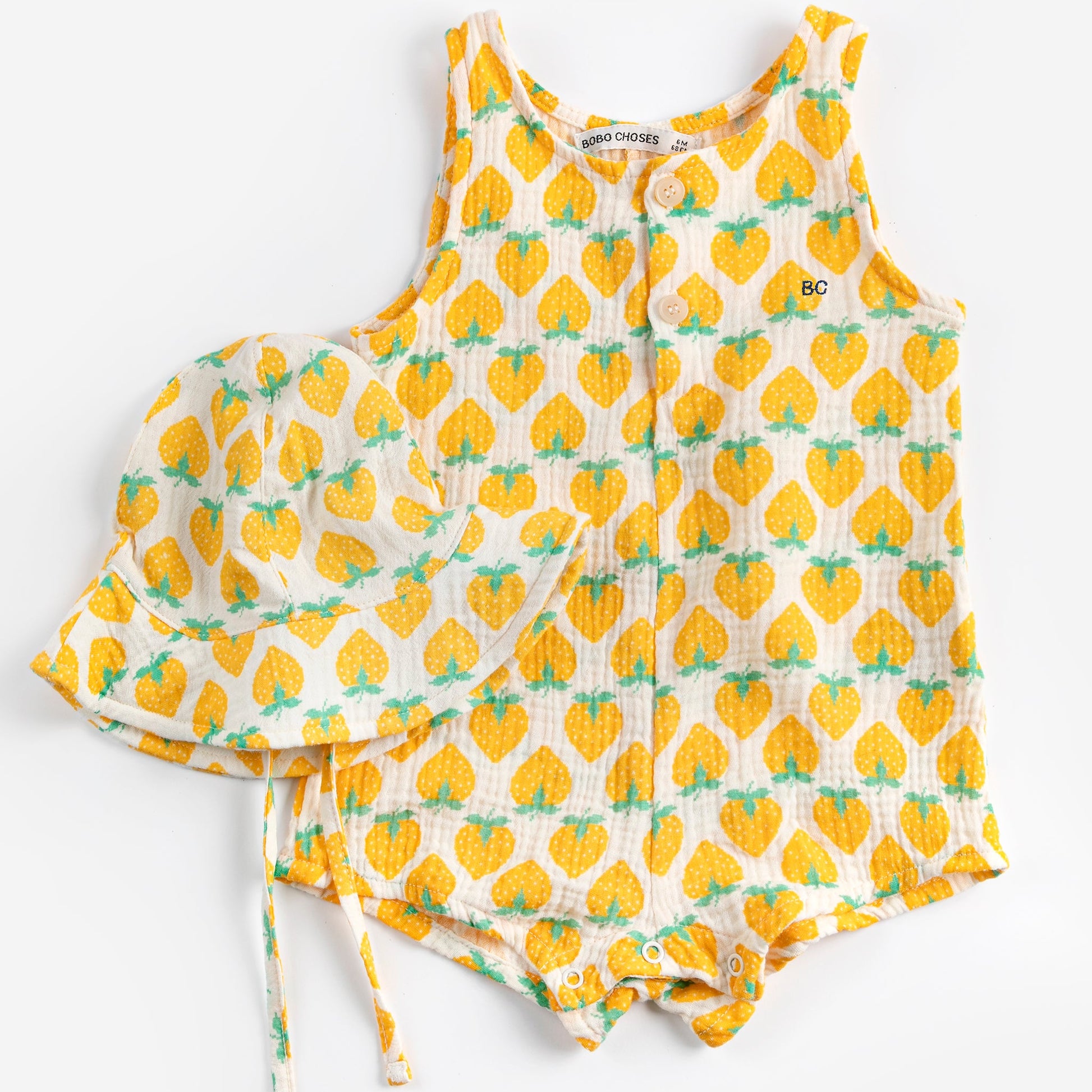 *Yellow playsuit - Designed with sleeveless, front button fastening, crotch snap fastening, embroidery, loose fit, short, structured fabric and wide shoulder straps.