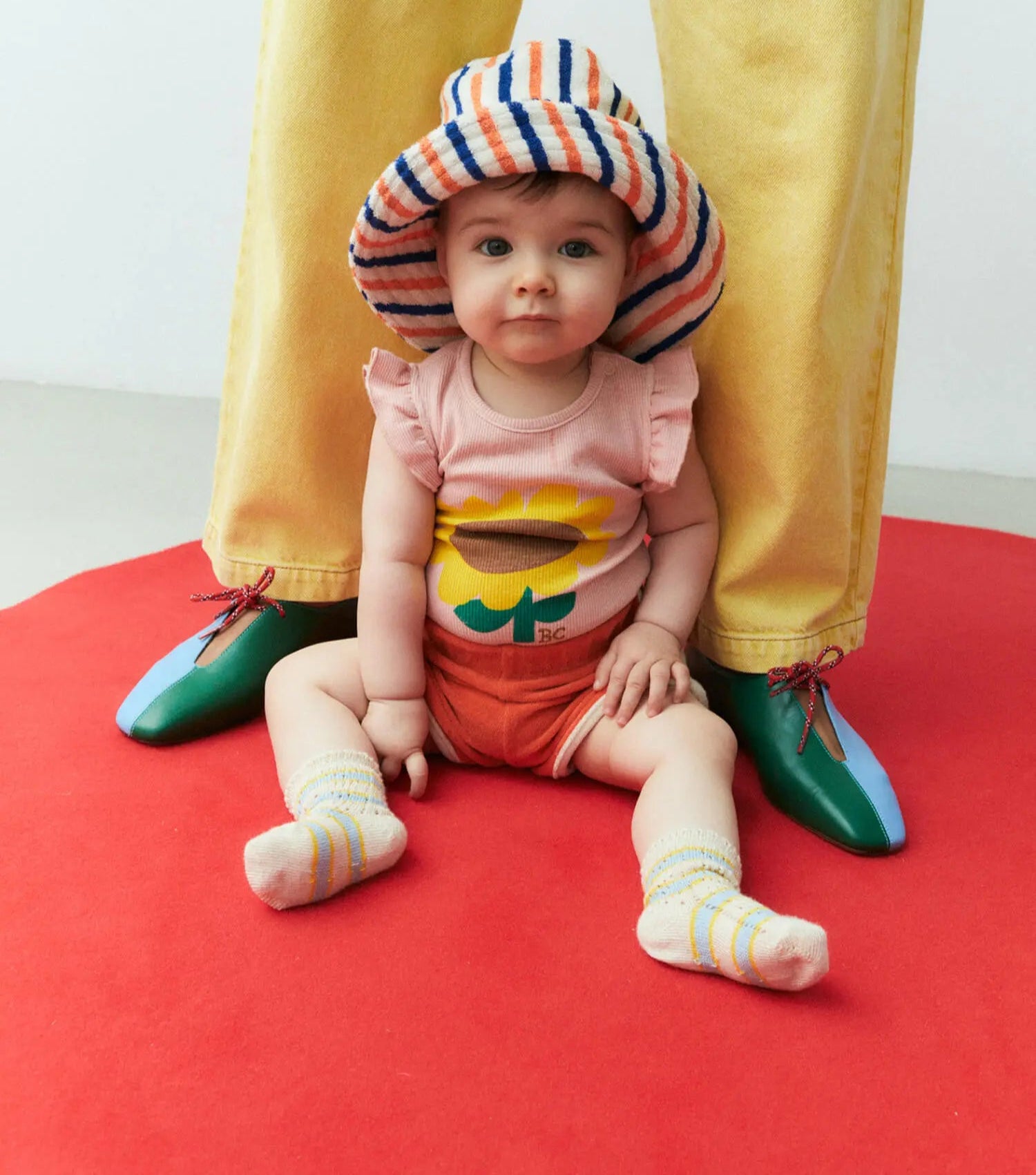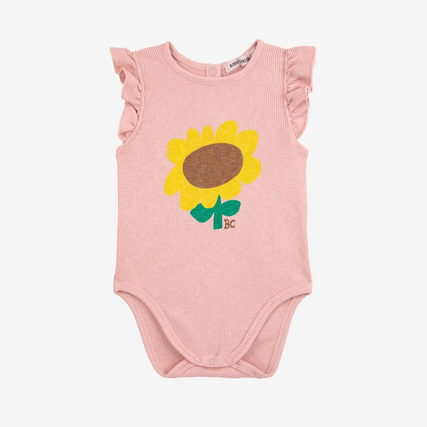 Made from 95% organic cotton and 5% elastane, it features a sleeveless design, regular crotch, and shoulder and crotch snap fastenings for easy wear. Embroidery details, a slim fit, a round neck, and ruffled accents add playful elegance.