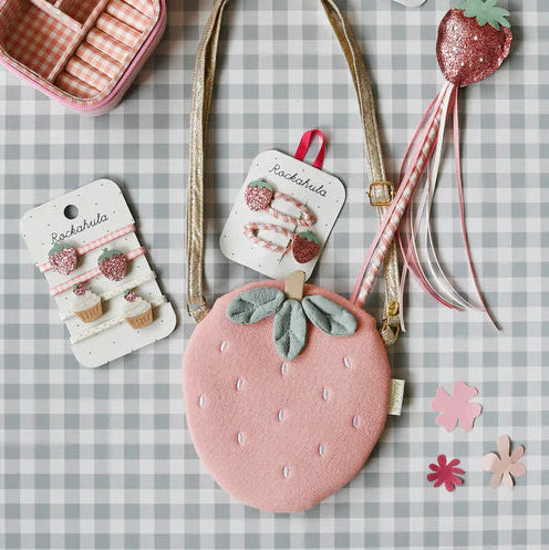Add a little sweetness to your day with our sweet little Strawberry Bag! Our fruity shaped bag features leaf detailing and is perfect for keeping your summer essentials safe! Fully lined in our pink spotty fabric, with a magnetic dot closure and an adjustable strap with a break point for safety.