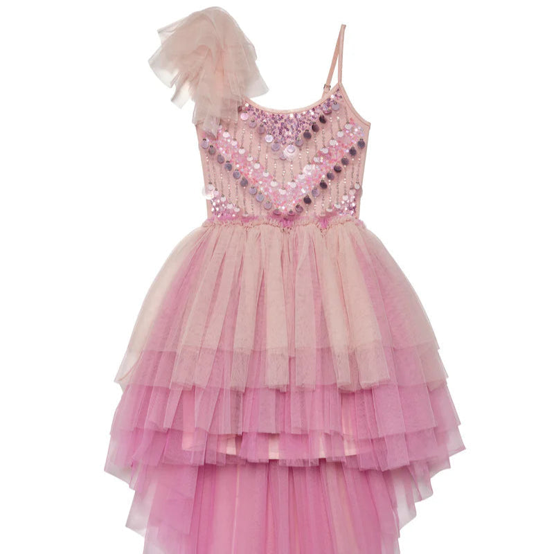 The Fonteyn Tutu Dress in Heavenly Pink Mix is a whirlwind of twirls and charm, made for the girl who knows how to have fun and look fabulous doing it. Our debut style boasts layers of ombre effect tulle that float around her as she spins, shifting from one dreamy pink hue to the next. The hi lo hem gives just the right touch of drama, while the halter bodice with delicate shoulder frills adds a dose of playful elegance. With intricate, eye-catching patterns and a perfectly placed bow motif, the Fonteyn Tutu Dress is all about bringing a little sparkle into everyday life.
