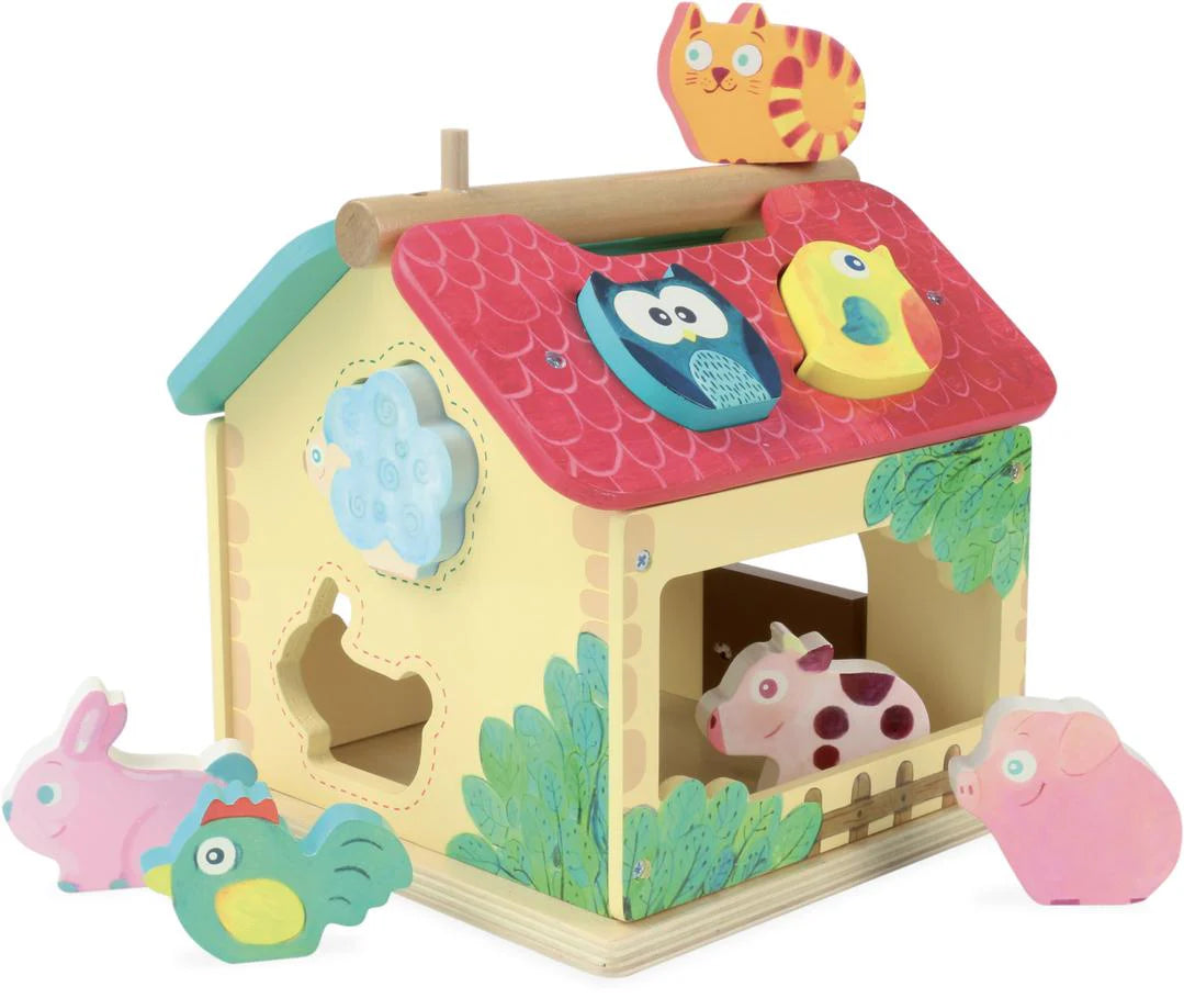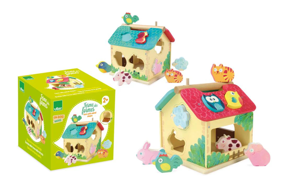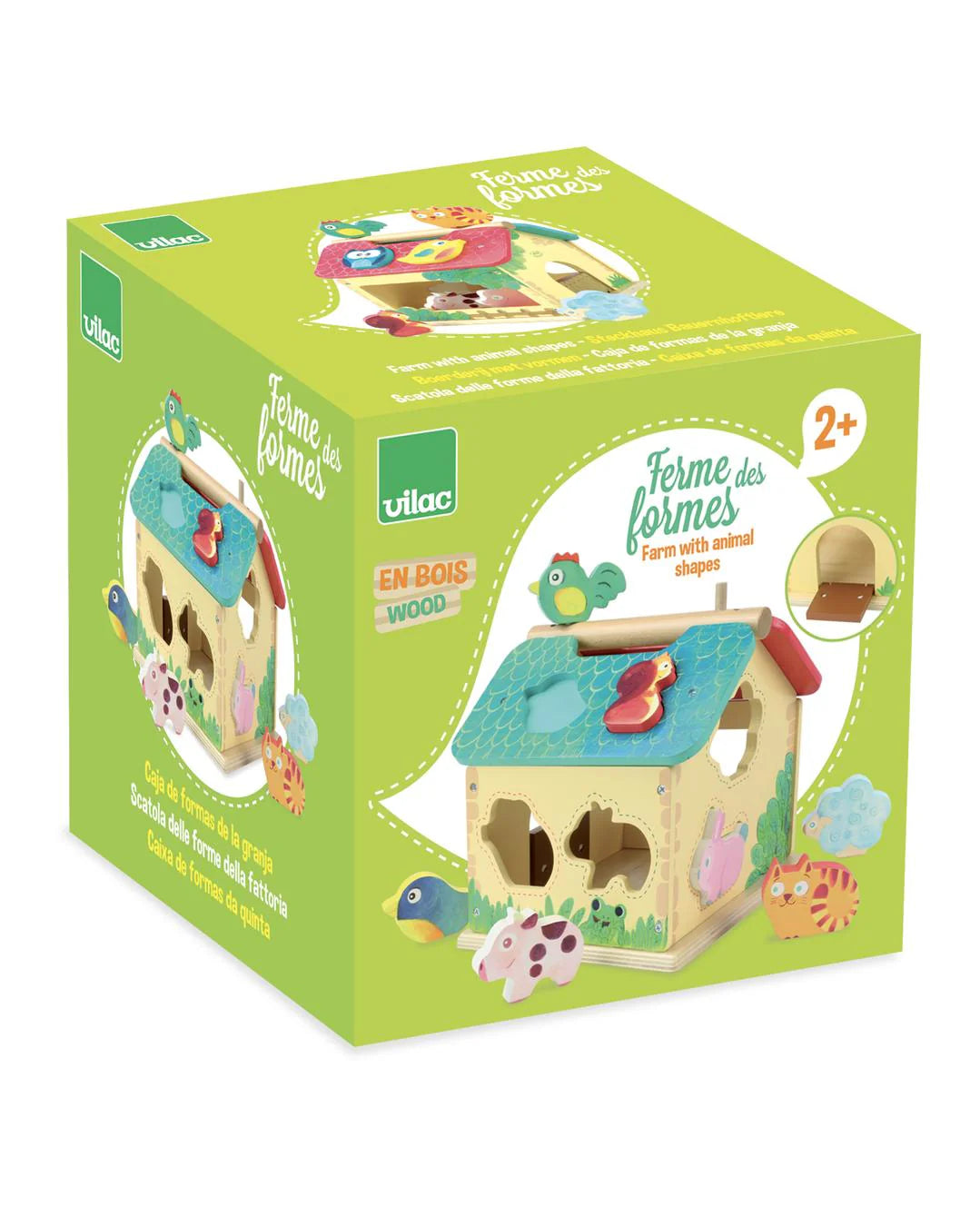 Wooden farm with animals by VILAC. Shaped wooden animals each have their own matching slot. Also serves as a charming stable to house all the animals.