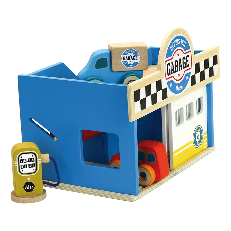 Vilac Vilacity Little Wooden Garage: A small wooden Vilacity garage with a washing station, parking and a garage for repairs. Comes with a truck, a car and a petrol pump. Garage measures approximately 27 x 17 x 15 cm . Safety rated for ages 3+.