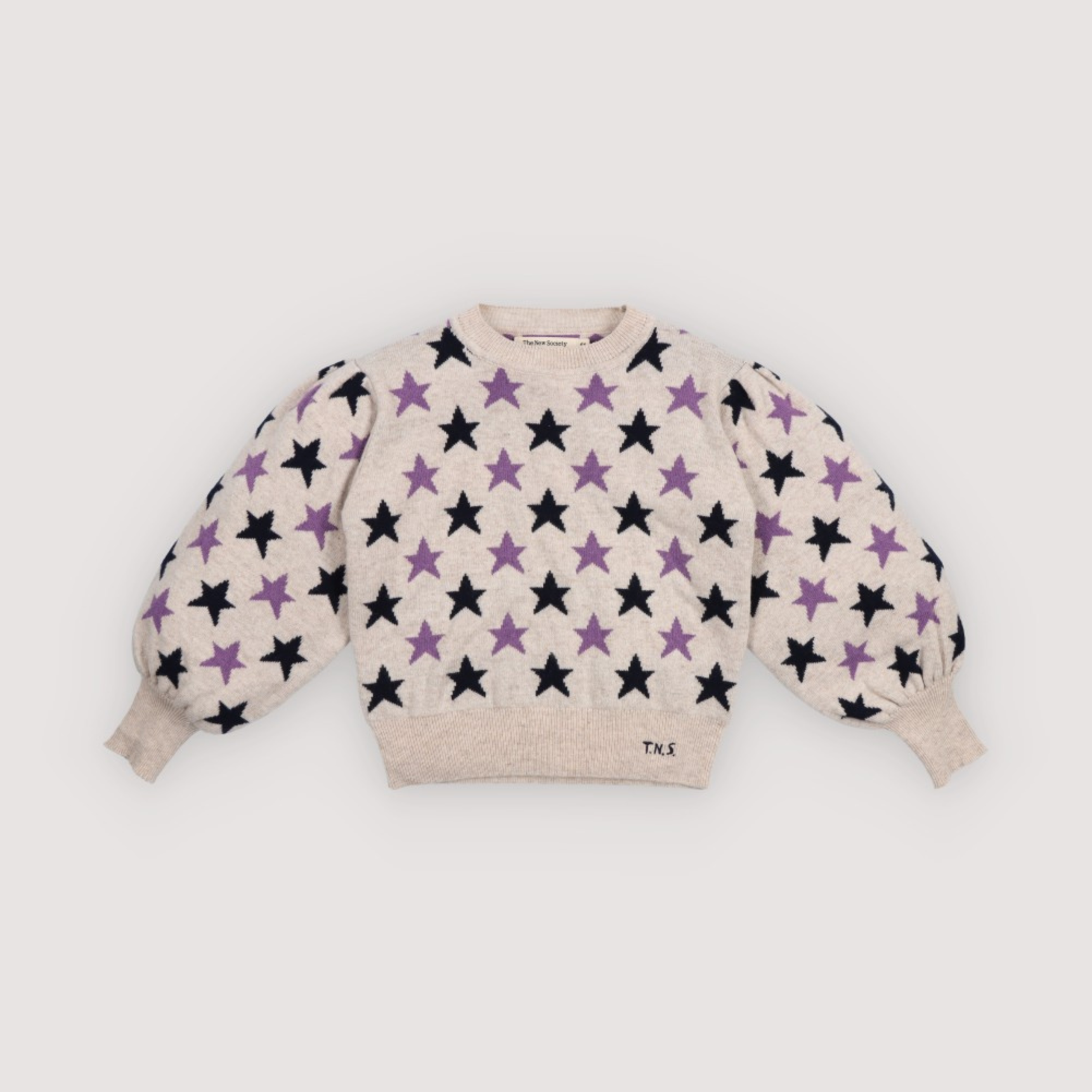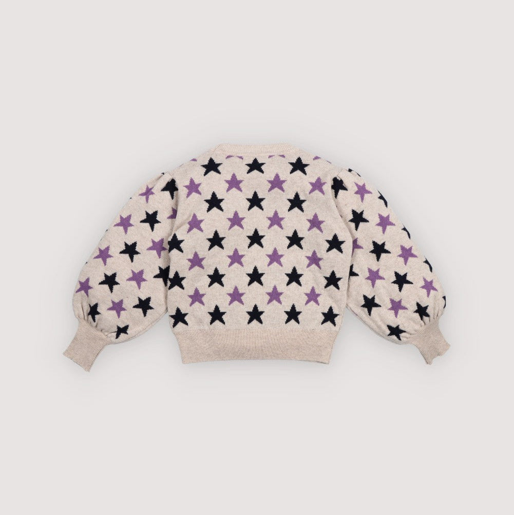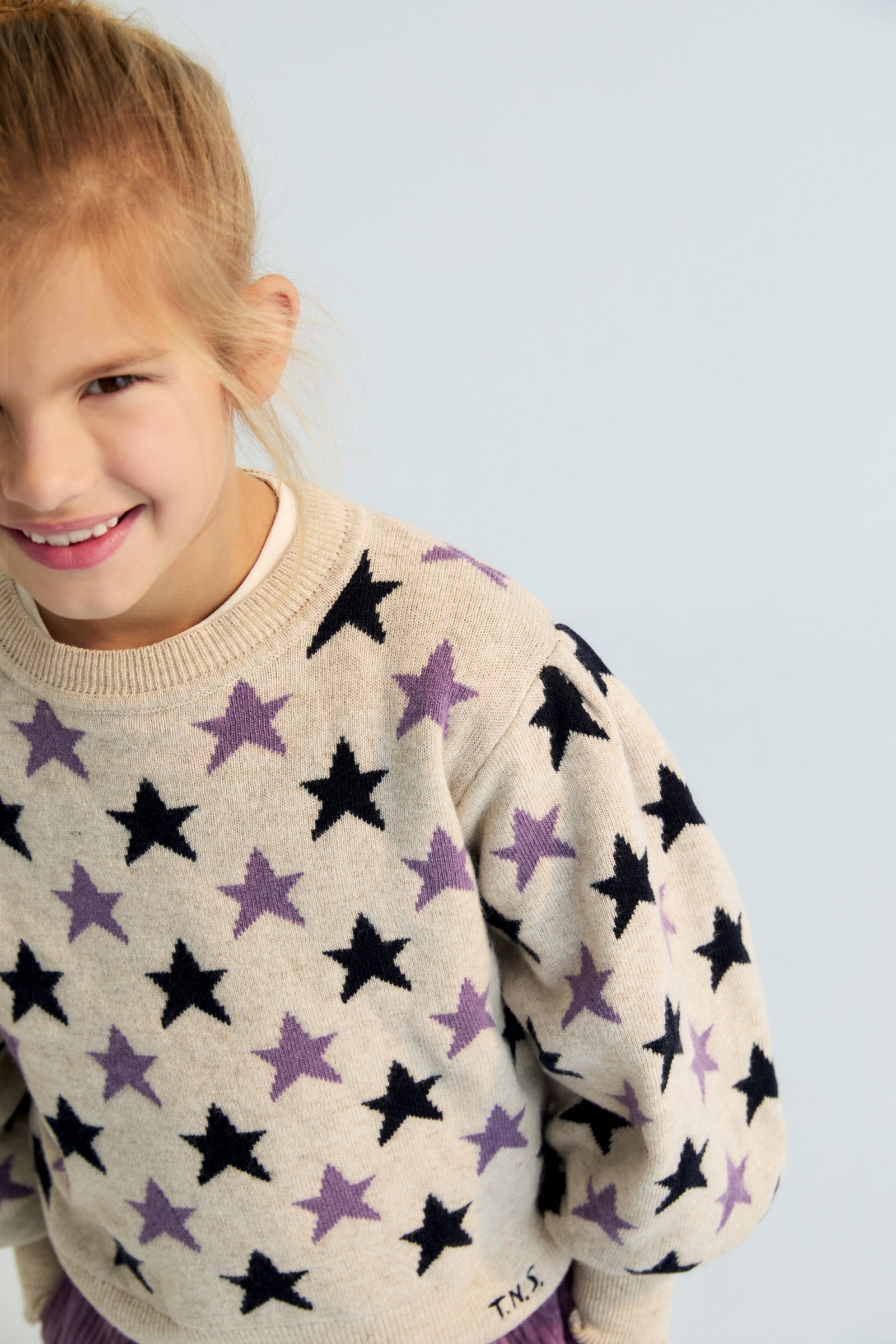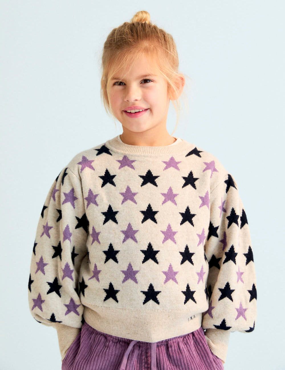 Bicolor recycled cashmere and wool with star pattern and brand embroidery detail on the cuffs. It features puffed sleeves with volume, gathered shoulders, and wide ribbed cuffs.