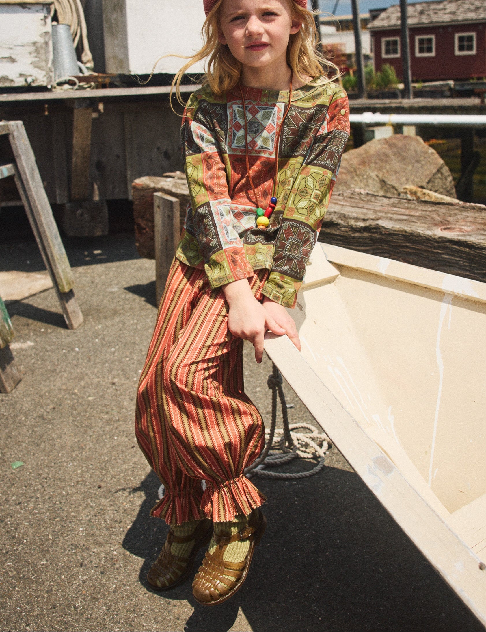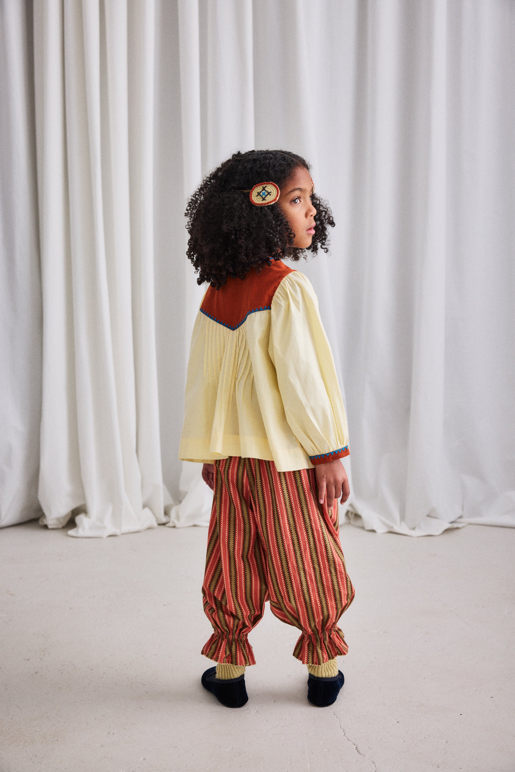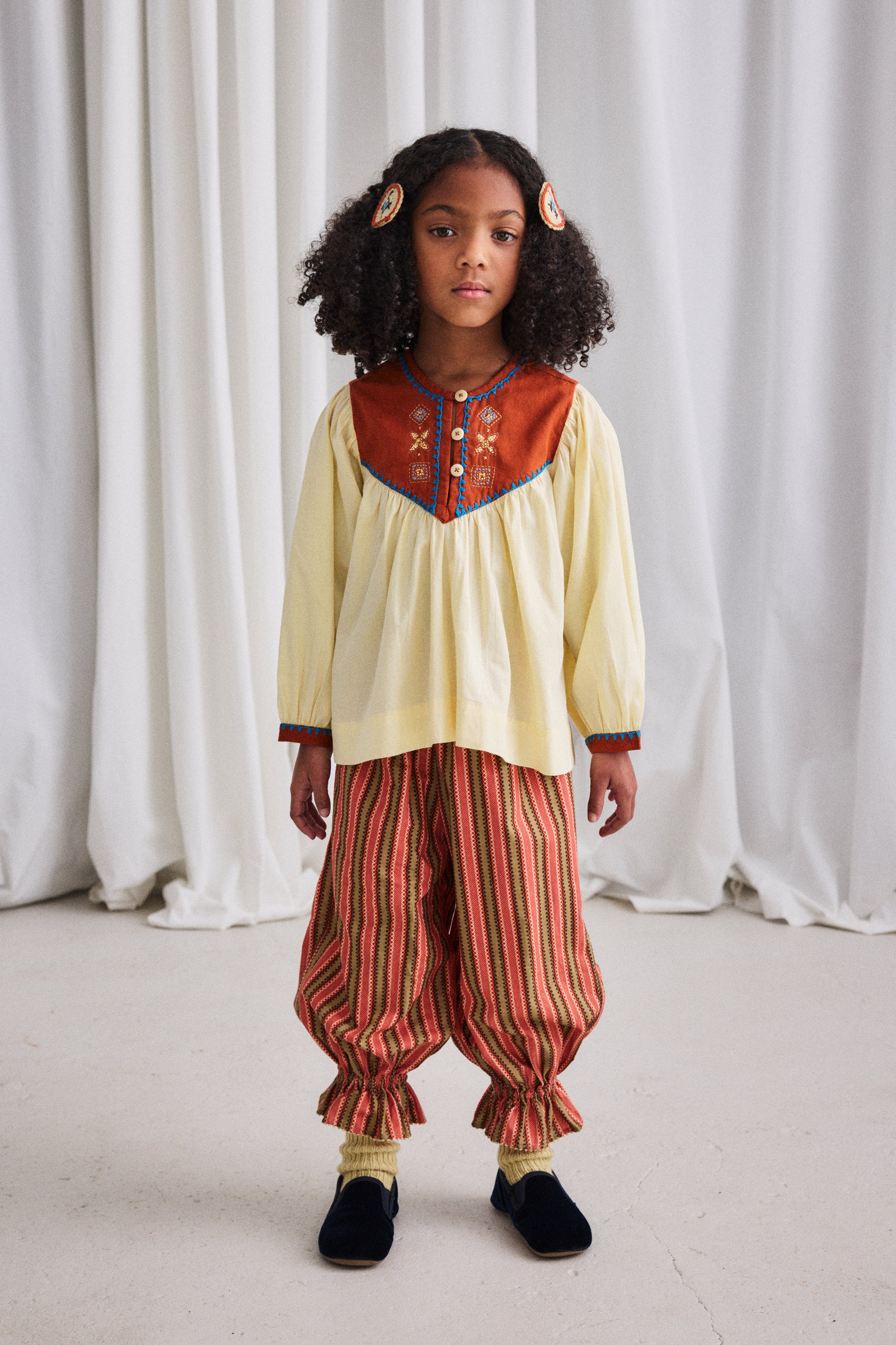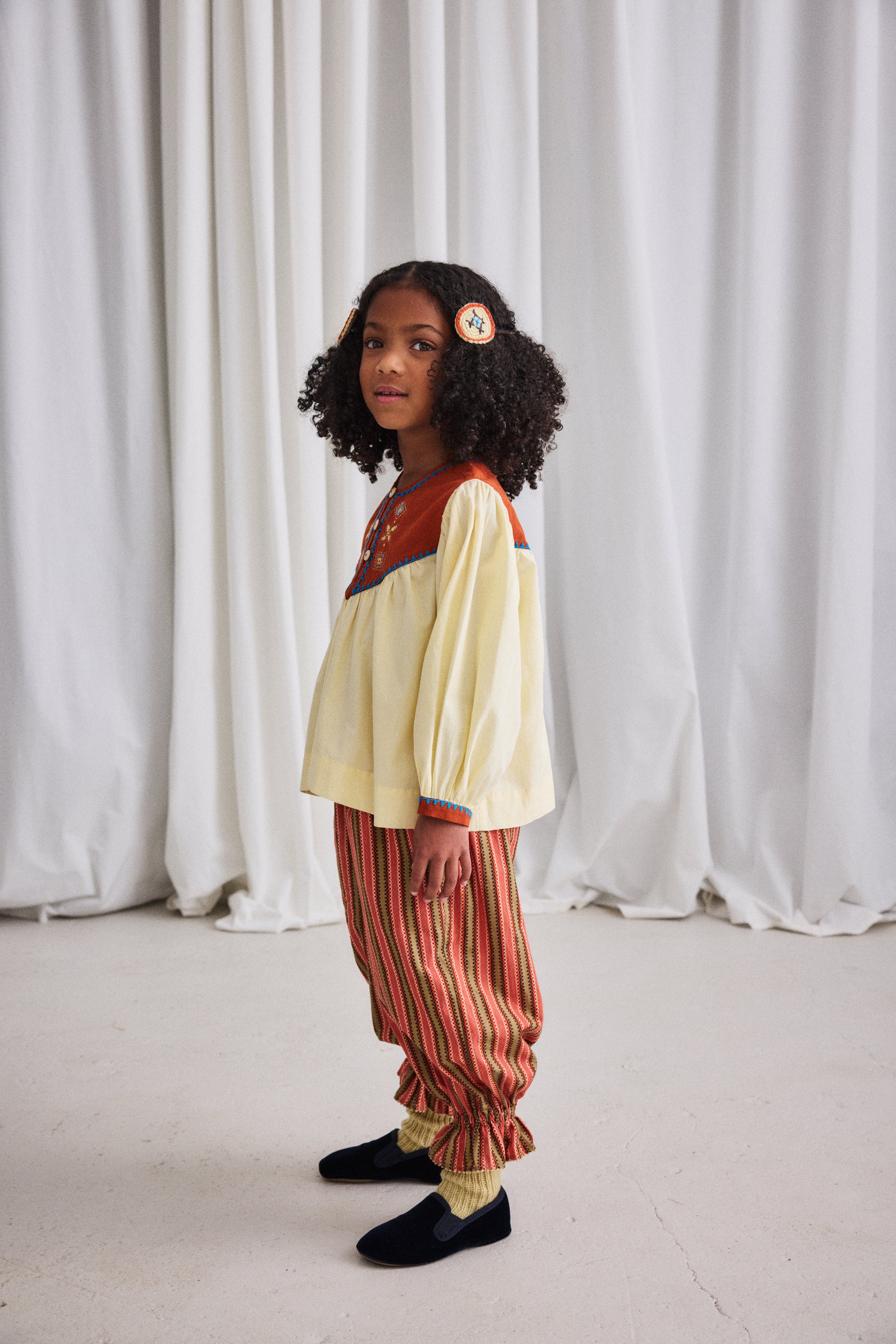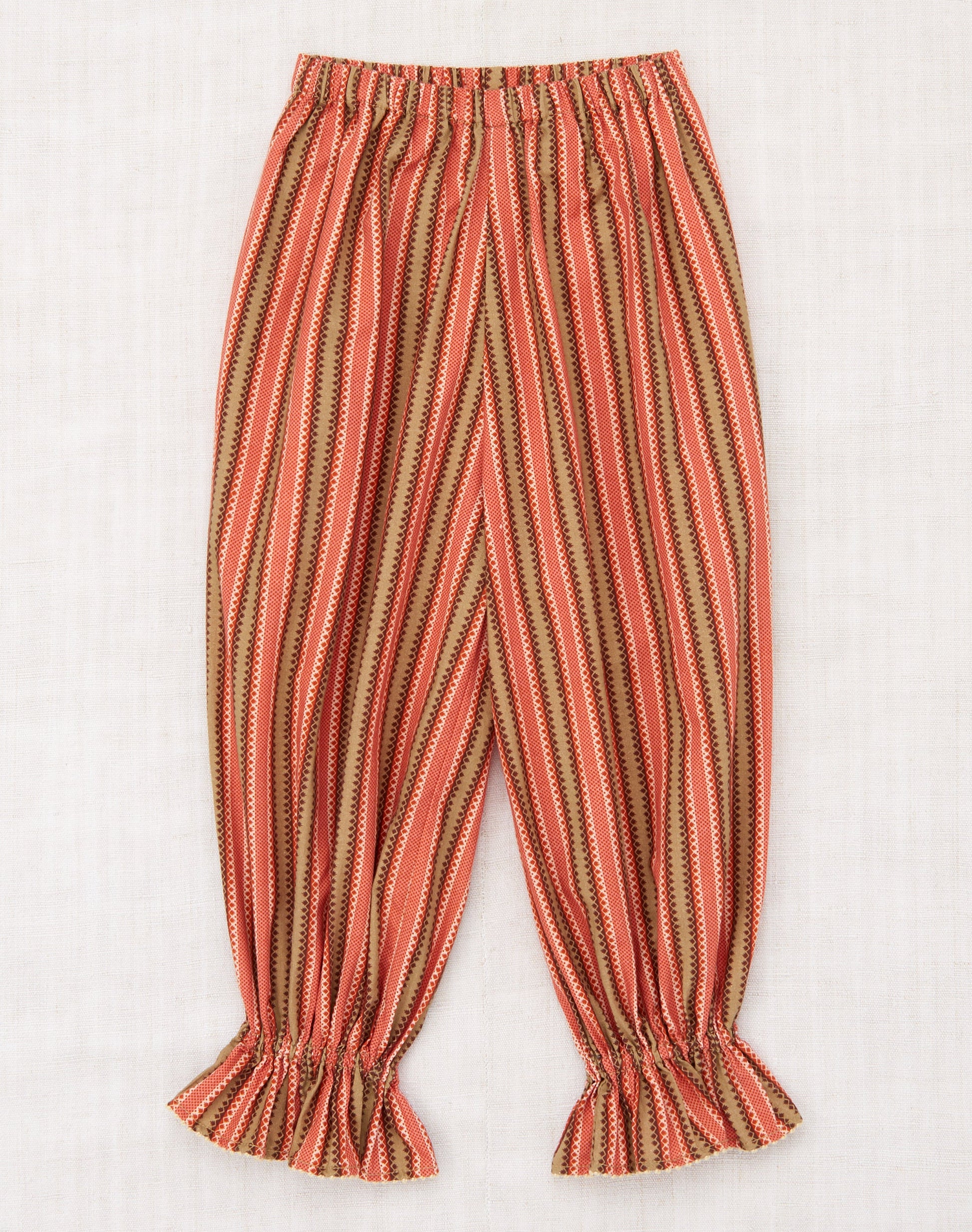 A statement-making pull-on pant in cotton twill, featuring a gathered elastic waistband and a ruffled hem with embroidered dot-stitch detailing, adding a touch of flair. Finished with French seams.